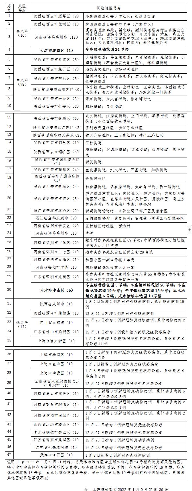 按照国务院应对新冠肺炎疫情联防联控机制关于科学划分、精准防控等工作要求,经天津市防控指挥部研判,并经天津市防控领导小组同意,自2022年1月9日21时起,天津市将津南区辛庄镇林锦花园24号楼划定为高风险地区,将天津市津南区辛庄镇林绣花园5号楼、辛庄镇林锦花园26号楼、辛庄镇林锦花园19号楼、辛庄镇林锦花园15号楼、咸水沽镇众惠里5号楼、咸水沽镇丰达园10号楼划定为中风险地区。