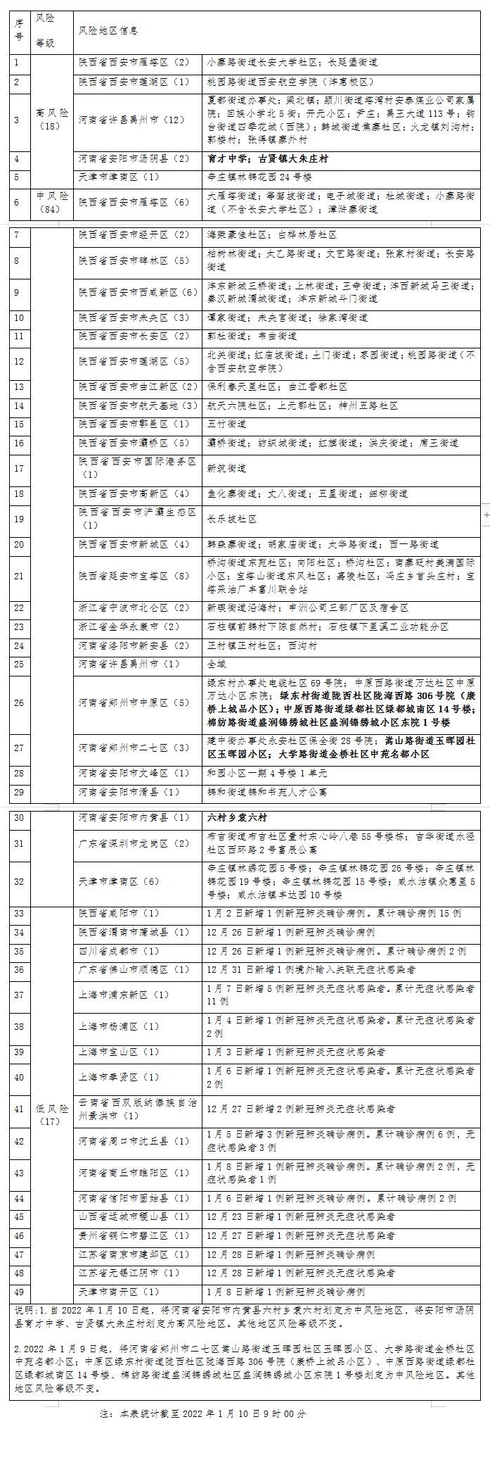 自2022年1月10日起,河南省安阳市汤阴县育才中学、古贤镇大朱庄村划定为高风险地区,安阳市内黄县六村乡袁六村划定为中风险地区。