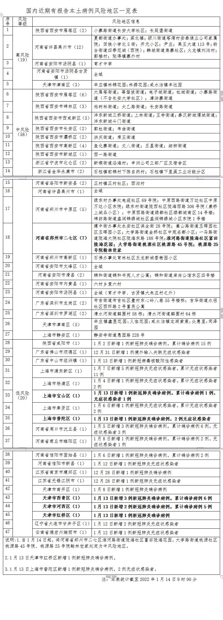 自1月14日起,河南省郑州市二七区淮河路街道陇海社区富田陇海花园,大学路街道桃源社区桃源路45号院、桃源路25号院翰林世家划定为中风险地区。