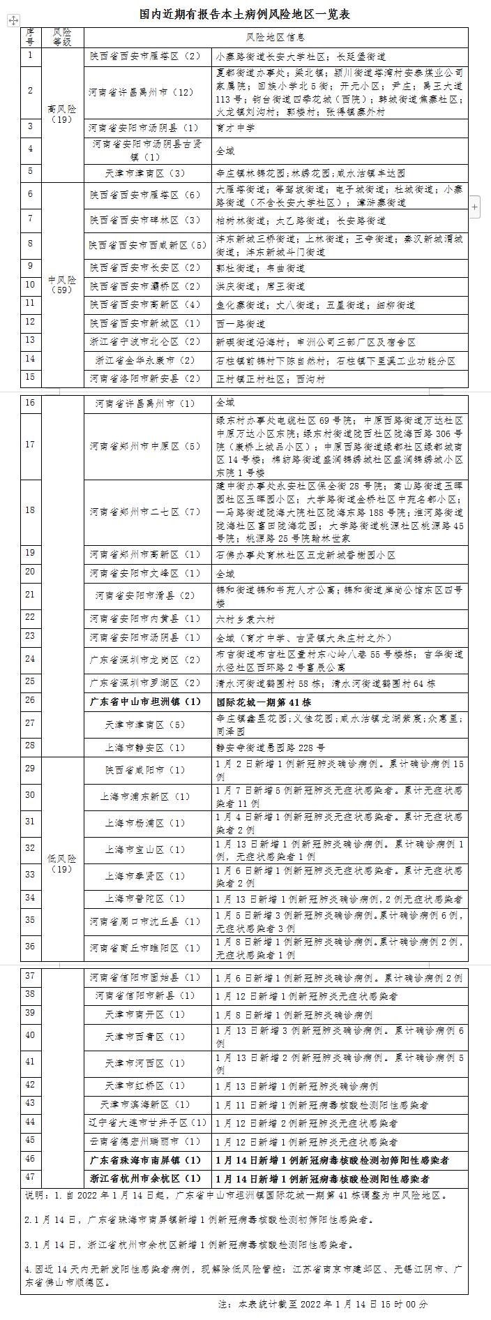 自2022年1月14日起,广东省中山市坦洲镇国际花城一期第41栋调整为中风险地区。