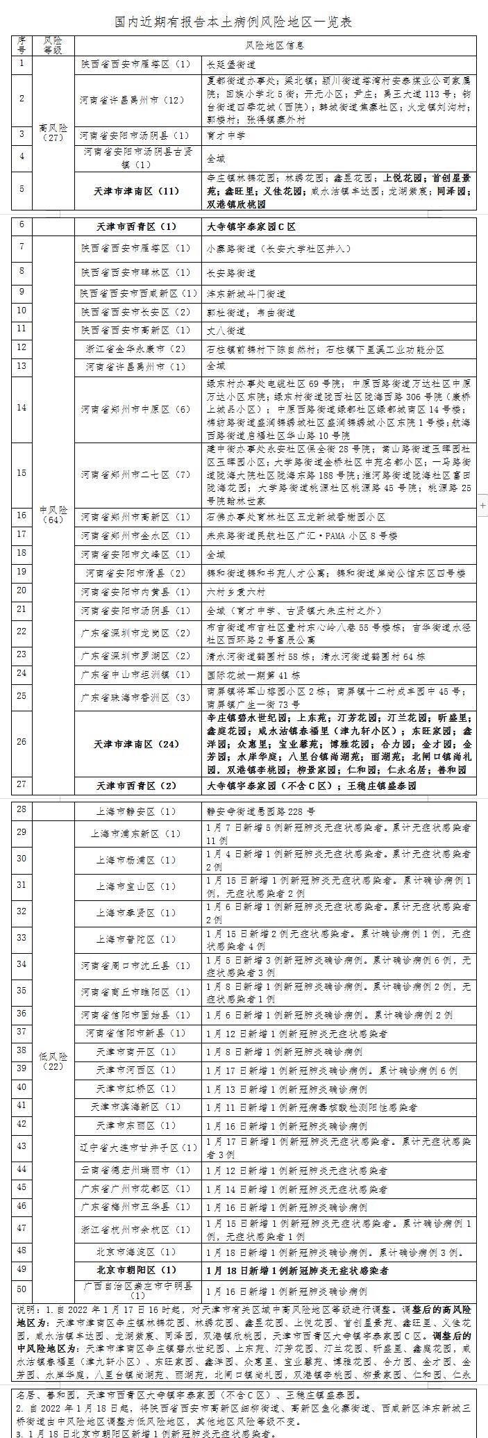 自2022年1月17日16时起,对天津市有关区域中高风险地区等级进行调整。调整后的高风险地区为:天津市津南区辛庄镇林锦花园、林绣花园、鑫昱花园、上悦花园、首创星景苑、鑫旺里、义佳花园,咸水沽镇丰达园、龙湖紫宸、同泽园,双港镇欣桃园,天津市西青区大寺镇宇泰家园C区。调整后的中风险地区为:天津市津南区辛庄镇碧水世纪园、上东苑、汀芳花园、汀兰花园、昕盛里、鑫庭花园,咸水沽镇春福里(津九轩小区)、东旺家园、鑫洋园、众惠里、宝业馨苑、博雅花园、合力园、金才园、金芳园、水岸华庭,八里台镇尚湖苑、丽湖苑,北闸口镇尚礼园,双港镇李桃园、柳景家园、仁和园、仁永名居、善和园,天津市西青区大寺镇宇泰家园(不含C区)、王稳庄镇盛泰园。