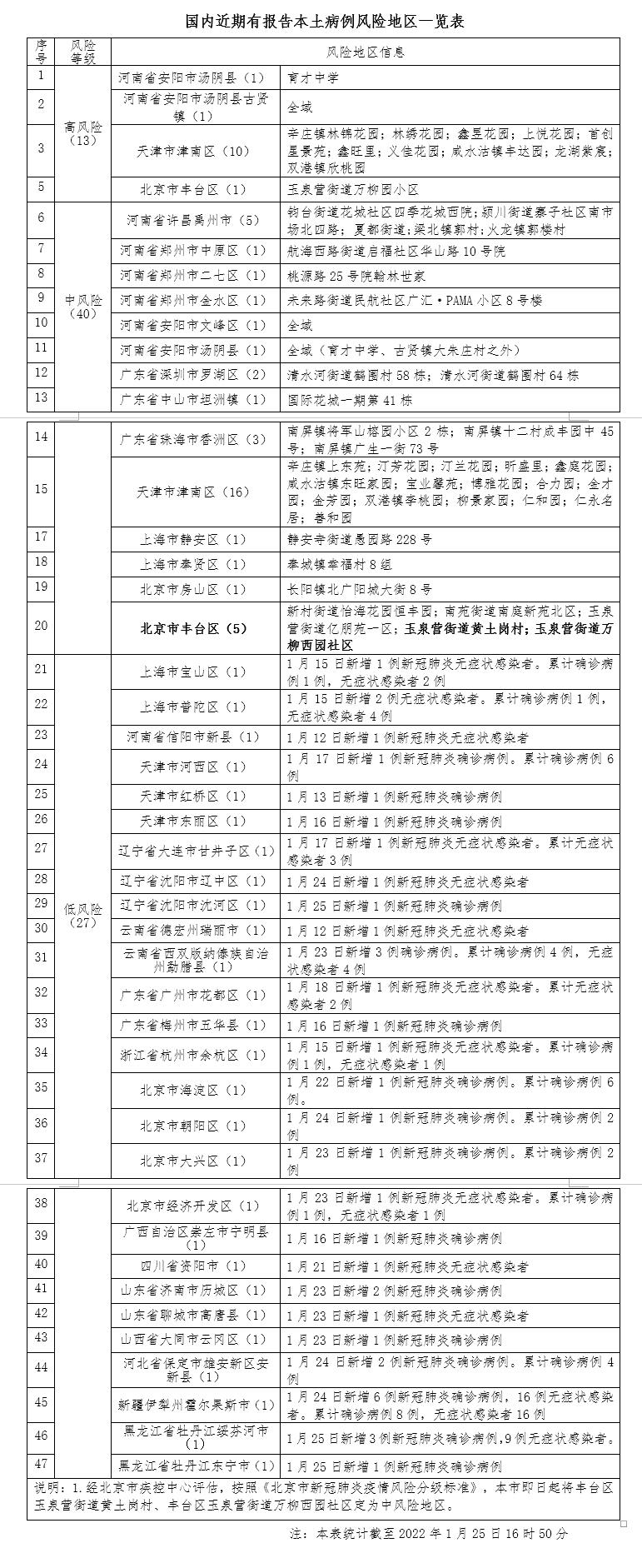 1月25日,在北京市新型冠状病毒肺炎疫情防控工作第275场新闻发布会通报,截至2022年1月25日12时,丰台区玉泉营街道黄土岗村14天累计报告2例本土确诊病例,丰台区玉泉营街道万柳西园社区近14天累计报告2例本土确诊病例。经北京市疾控中心评估,按照《北京市新冠肺炎疫情风险分级标准》,即日起将丰台区玉泉营街道黄土岗村、丰台区玉泉营街道万柳西园社区定为中风险地区。北京市现有高风险地区1个,中风险地区6个。
