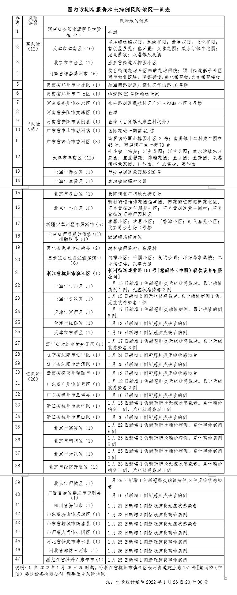 自2022年1月26日20时起,浙江省杭州市滨江区长河街道建业路151号[慧而特(中国)餐饮设备有限公司]调整为中风险地区。