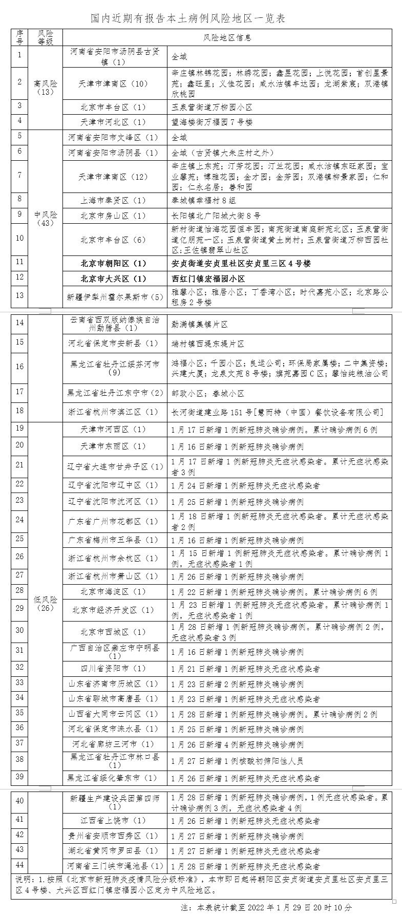 按照《北京市新冠肺炎疫情风险分级标准》,北京市即日起将朝阳区安贞街道安贞里社区安贞里三区4号楼、大兴区西红门镇宏福园小区定为中风险地区。