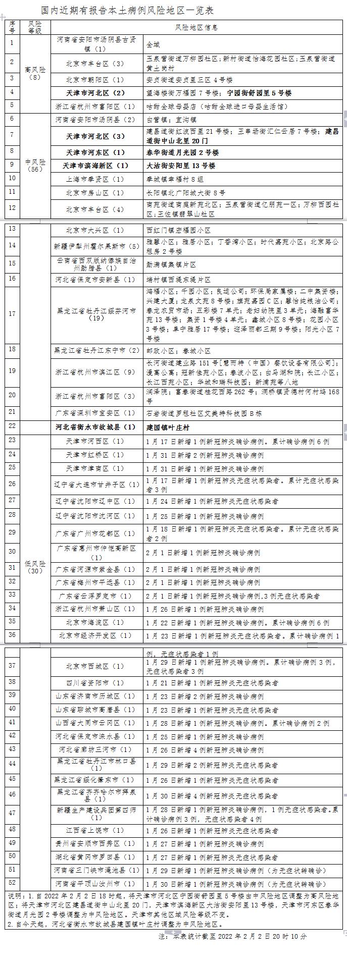 自2022年2月2日18时起,天津市河北区宁园街舒园里5号楼由中风险地区调整为高风险地区;天津市河北区建昌道街中山北里20门,天津市滨海新区大沽街安阳里13号楼,天津市河东区春华街道月光园2号楼调整为中风险地区。
