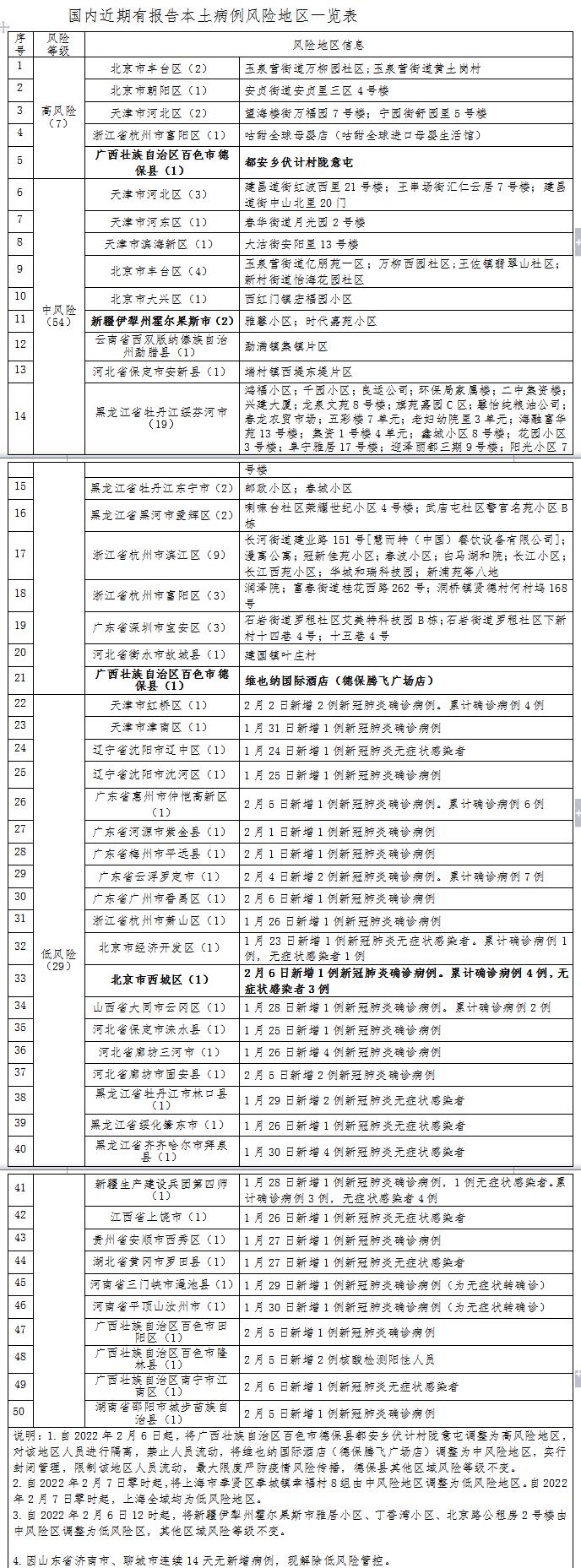 自2022年2月6日起,广西壮族自治区百色市德保县都安乡伏计村陇意屯调整为高风险地区;维也纳国际酒店(德保腾飞广场店)调整为中风险地区,德保县其他区域风险等级不变。