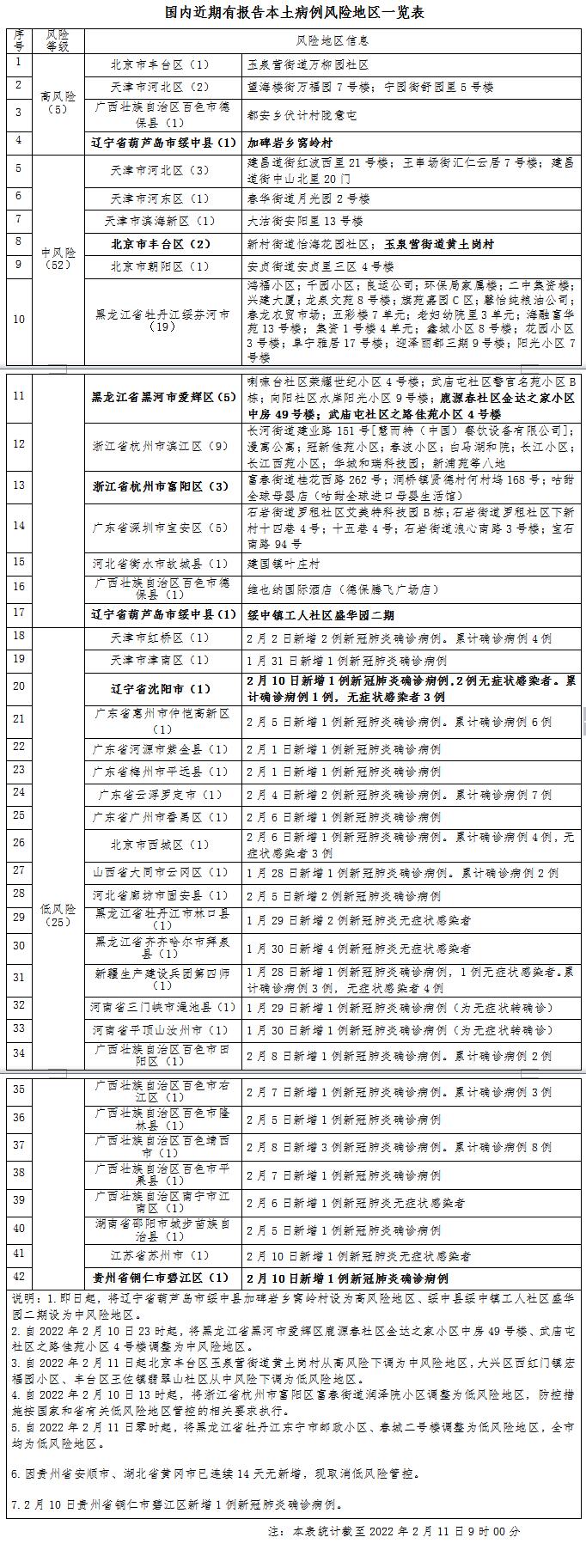 自2022年2月10日23时起,黑龙江省黑河市爱辉区鹿源春社区金达之家小区中房49号楼、武庙屯社区之路佳苑小区4号楼调整为中风险地区。