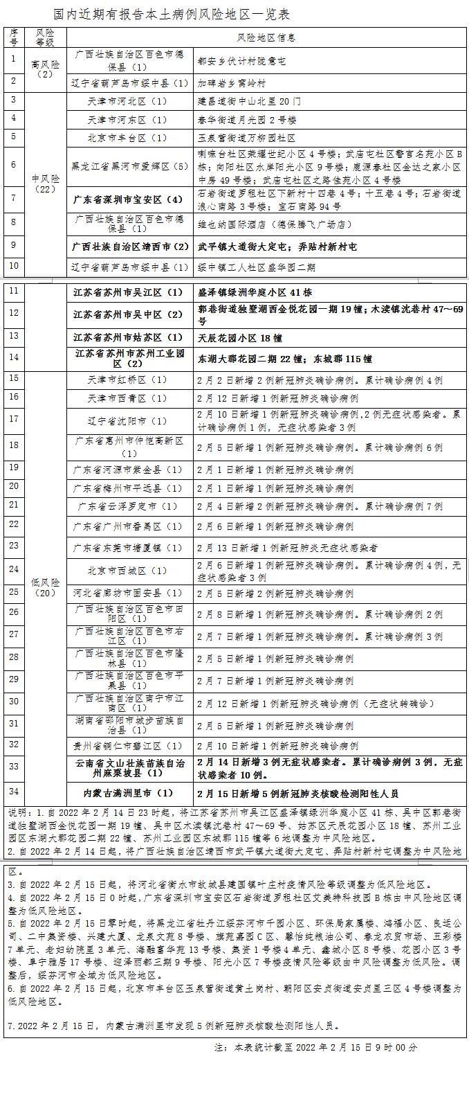 自2022年2月14日23时起,江苏省苏州市吴江区盛泽镇绿洲华庭小区41栋、吴中区郭巷街道独墅湖西金悦花园一期19幢、吴中区木渎镇沈巷村47~69号、姑苏区天辰花园小区18幢、苏州工业园区东湖大郡花园二期22幢、苏州工业园区东城郡115幢等6地调整为中风险地区。