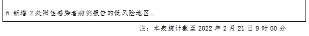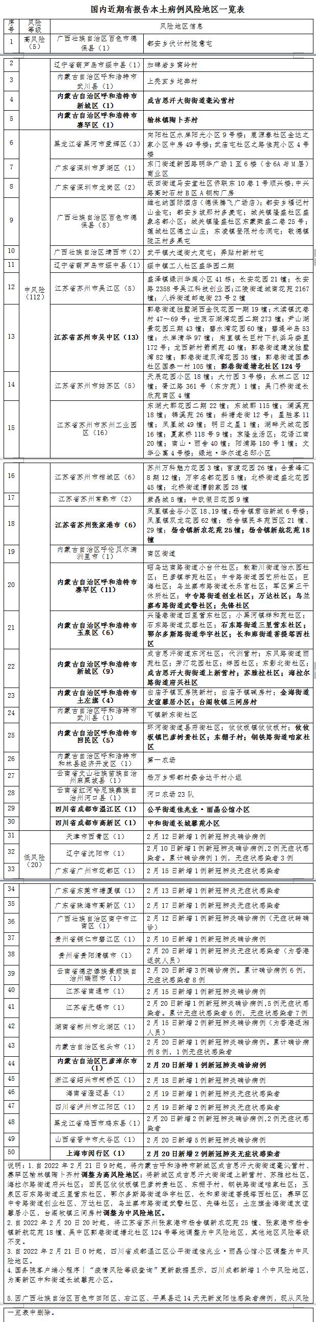 2、自2022年2月20日20时起,江苏省苏州张家港市将杨舍镇新农花苑25幢、张家港市杨舍镇新航花苑18幢、吴中区郭巷街道塘北社区124号等地调整为中风险地区。