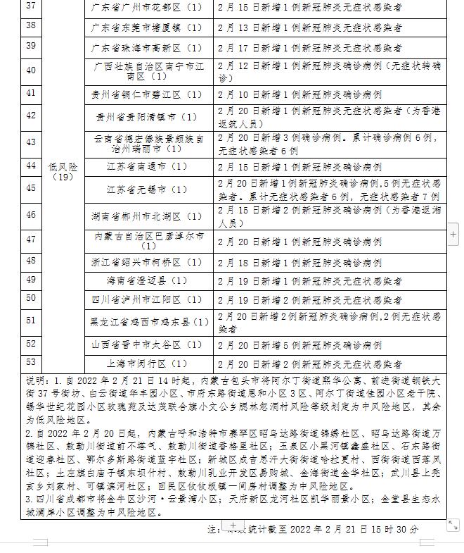 2.自2022年2月21日14时起,内蒙古包头市将阿尔丁街道熙华公寓、前进街道钢铁大街37号街坊、白云街道华丰园小区、市府东路街道恩和小区3区、阿尔丁街道佳园小区老干院、锡华世纪花园小区玫瑰苑及达茂联合旗小文公乡腮林忽洞村风险等级划定为中风险地区。