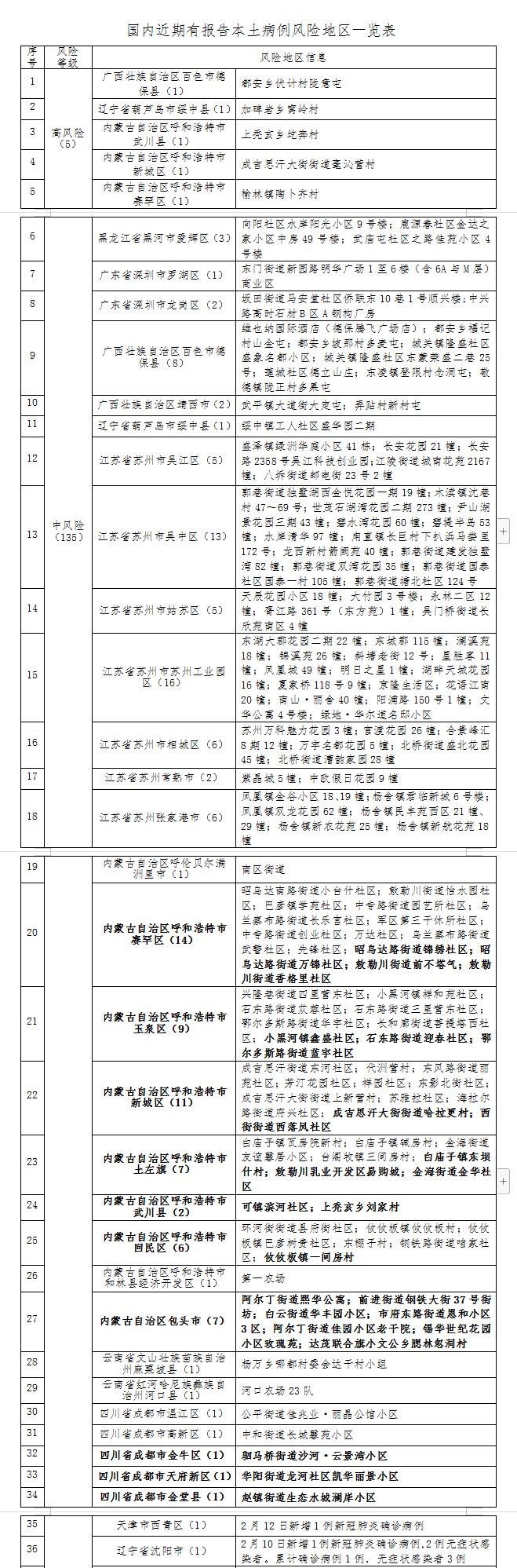 1.自2022年2月20日起,内蒙古呼和浩特市赛罕区昭乌达路街道锦绣社区、昭乌达路街道万锦社区、敕勒川街道前不塔气、敕勒川街道香格里社区;玉泉区小黑河镇鑫盛社区、石东路街道迎春社区、鄂尔多斯路街道蓝宇社区;新城区成吉思汗大街街道哈拉更村、西街街道西落凤社区;土左旗白庙子镇东坝什村、敕勒川乳业开发区易购城、金海街道金华社区;武川县上秃亥乡刘家村、可镇滨河社区;回民区攸攸板镇一间房村调整为中风险地区。
