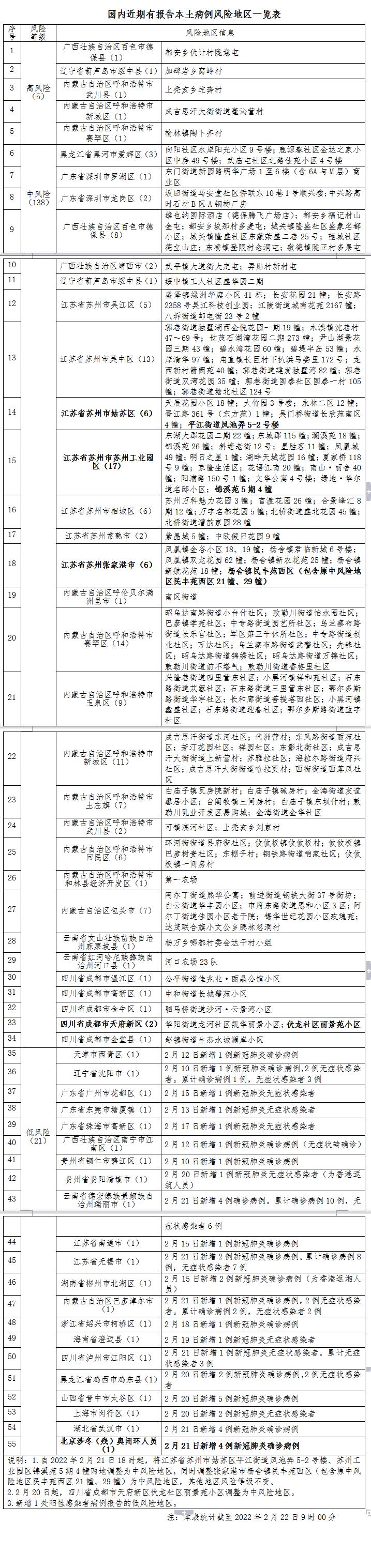 1、自2022年2月21日18时起,江苏省苏州市将姑苏区平江街道凤池弄5-2号楼、苏州工业园区锦溪苑5期4幢两地调整为中风险地区,同时调整张家港市杨舍镇民丰苑西区(包含原中风险地区民丰苑西区21幢、29幢)为中风险地区。
