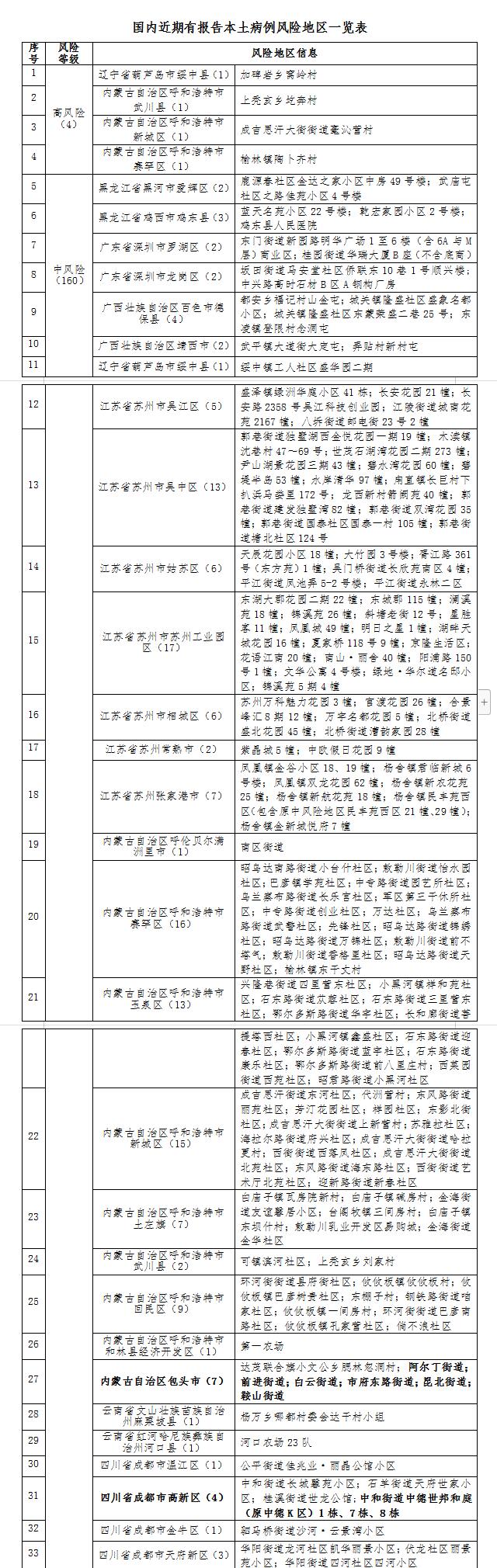 一、非必要勿前往四川成都高新区中和街道中德世邦和庭(原中德K区)1栋、7栋、8栋、内蒙古包头市昆都仑区阿尔丁街道、前进街道、白云街道、市府东路街道、昆北街道、鞍山街道6个地区、湖北武汉市东湖高新区关东街道保利时代天悦小区28栋、江岸区后湖街道同鑫花园小区29栋、青山区红卫路街道58街坊127门、有病例发生地区及国内已公布的高、中风险地区。如必须前往,需提前向社区、村屯或属地疾控中心报备,同时做好个人防护。