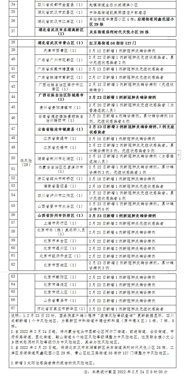 3.自2022年2月23日起,湖北武汉市将东湖高新区关东街道保利时代天悦小区28栋、江岸区后湖街道同鑫花园小区29栋、青山区红卫路街道58街坊127门调整为中风险地区。