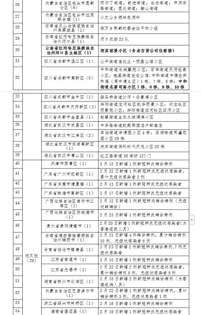 自2022年2月24日0时起,云南省河口县主城区的迎宾丽景小区(含老百货公司住宿楼)划为中风险地区。