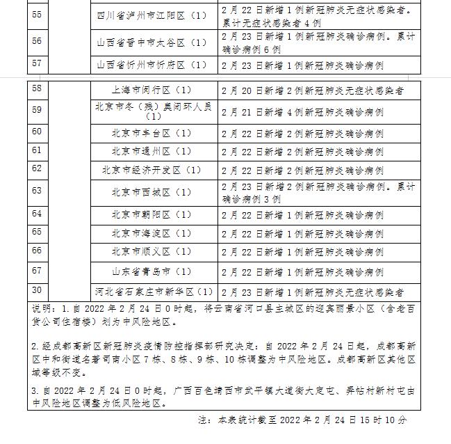 经成都高新区新冠肺炎疫情防控指挥部研究决定:自2022年2月24日起,成都高新区中和街道名著司南小区7栋、8栋、9栋、10栋调整为中风险地区。