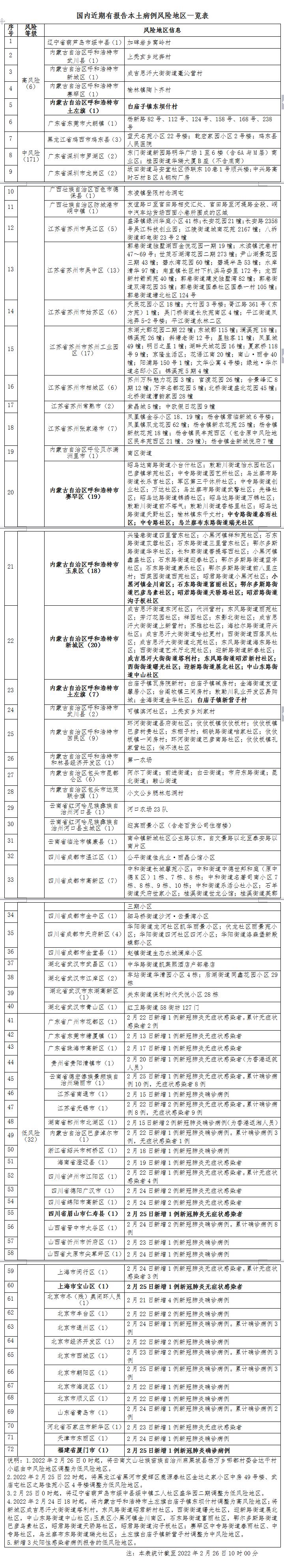 2022年2月24日18时起,内蒙古呼和浩特市将土左旗白庙子镇东坝什村调整为高风险地区;将新城区成吉思汗大街街道塔利村,东风路街道昭君新村社区,西街街道曙光社区,迎新路街道展北社区,中山东路街道中山社区;玉泉区小黑河镇金川南区,石东路街道富丽社区,鄂尔多斯路街道巴彦乌素社区,昭君路街道天骄路社区,昭君路街道沟子板社区;赛罕区中专路街道春雨社区、中专路社区,乌兰察布东路街道瑞光社区;土左旗白庙子镇新营子村调整为中风险地区。