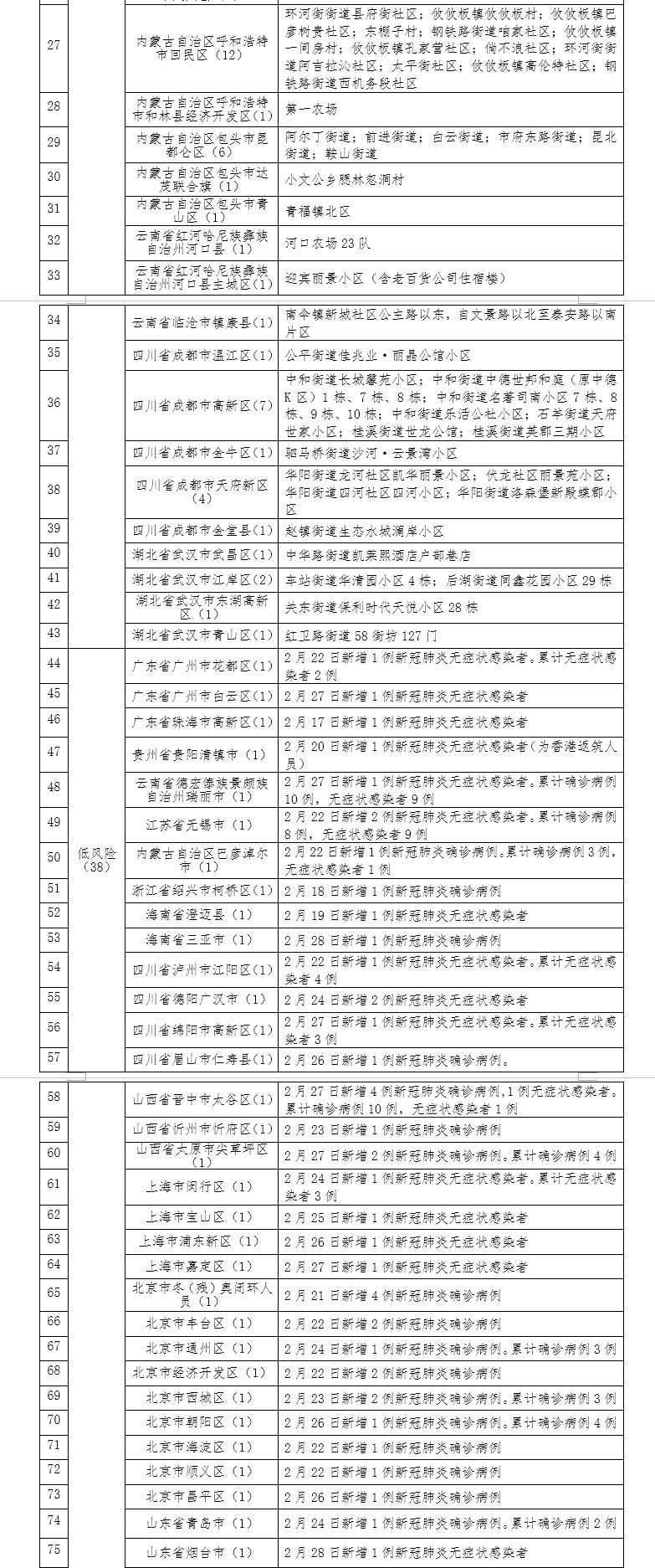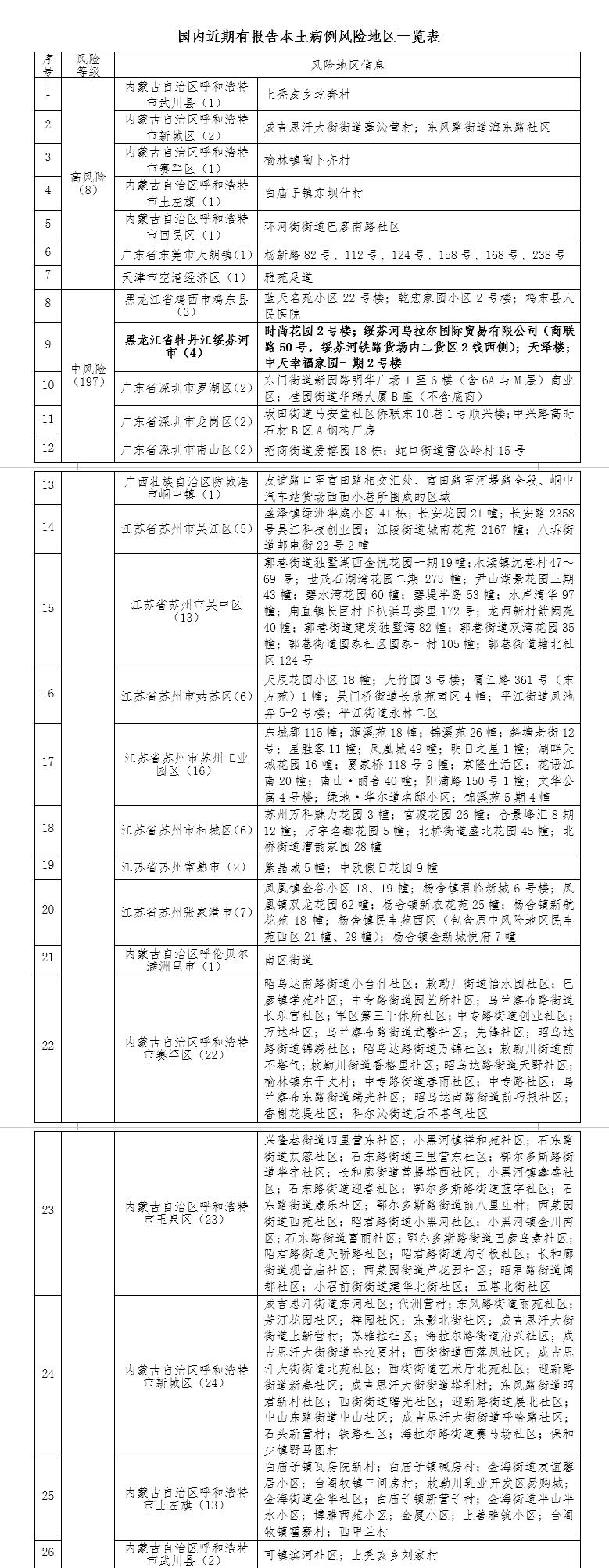 自2月28日16时起,黑龙江省牡丹江绥芬河市时尚花园2号楼、绥芬河乌拉尔国际贸易有限公司(商联路50号,绥芬河铁路货场内二货区2线西侧)、天泽楼、中天幸福家园一期2号楼调整为中风险地区。