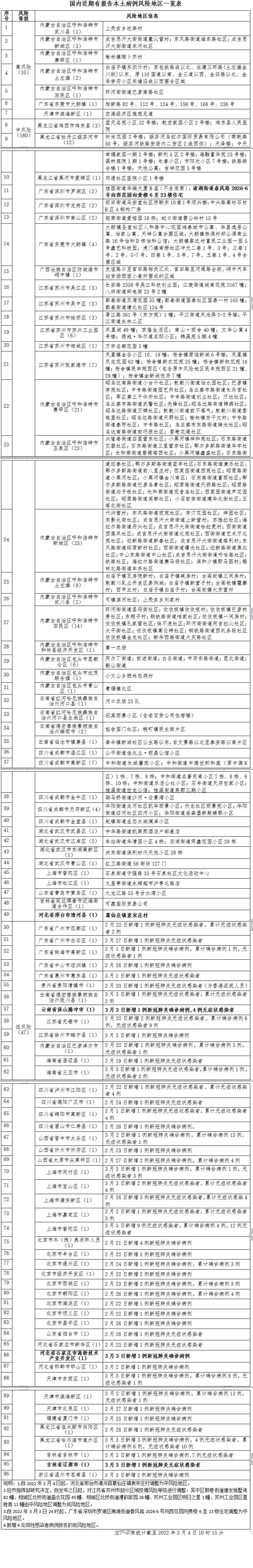 3月4日,深圳市罗湖区新型冠状病毒肺炎疫情防控指挥部办公室通告(第27号),自2022年3月3日24时起,广东省深圳市将罗湖区南湖街道春风路2026-6号向西花园向贵楼6至23楼住宅调整为中风险地区。