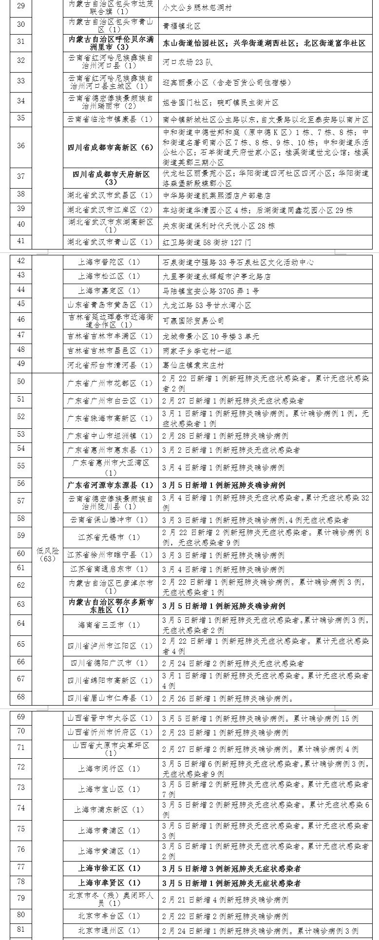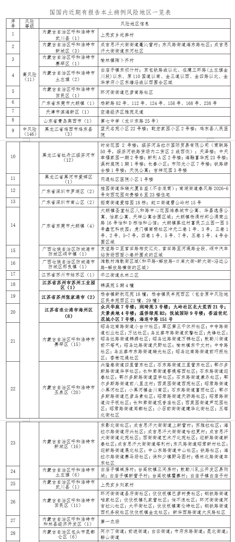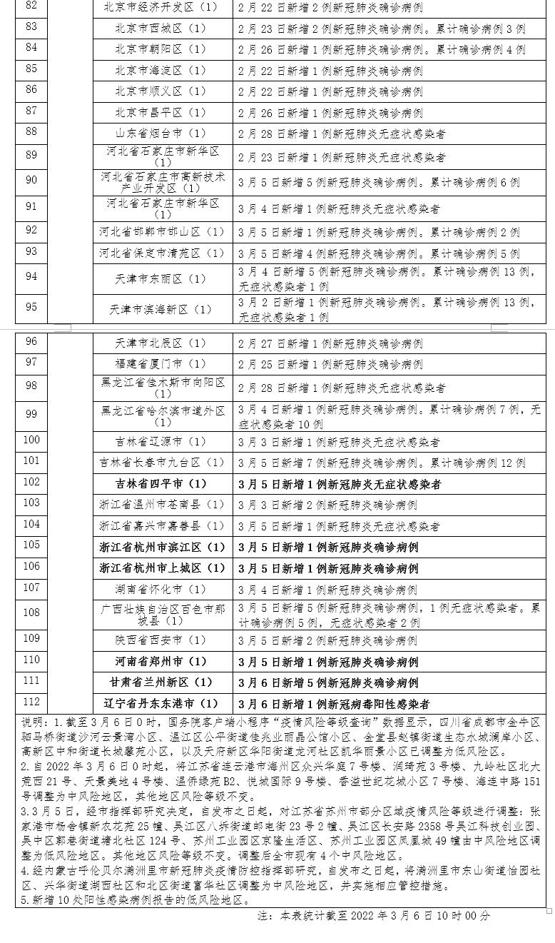 自2022年3月6日0时起,将江苏省连云港市海州区众兴华庭7号楼、润琦苑3号楼、九岭社区北大荒西21号、天景美地4号楼、温侨绿苑B2、悦城国际9号楼、香溢世纪花城小区7号楼、海连中路151号调整为中风险地区。