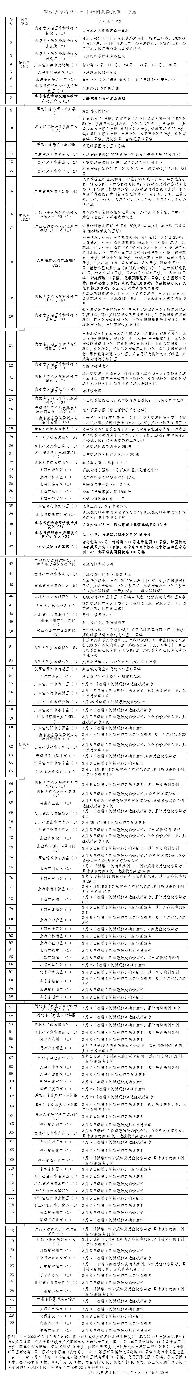 自2022年3月9日起,江苏省连云港市海州区新建西路30号楼、天顺国际花园7号楼、仕方国际9号楼、振兴公寓6号楼、众兴华庭10号楼、壹品国际C区、凤凰名都10号楼,连云区万润华泰小区7号楼调整为中风险地区。