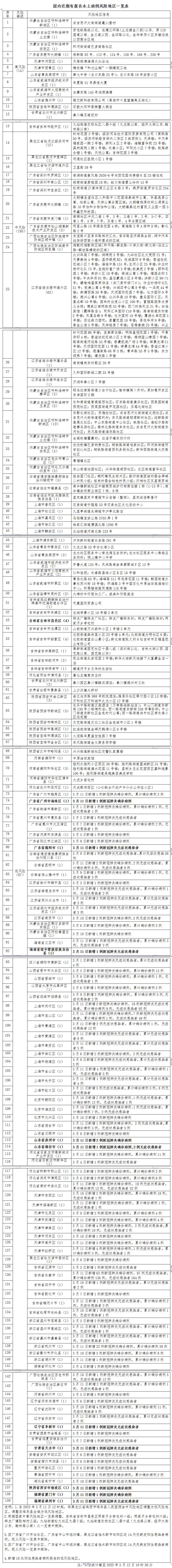 根据国家中高风险地区一览表调整,吉林省吉林市昌邑区两家子乡李屯村一组;两家子乡李屯村六组;桦皮厂镇张相村三组;九站街道松九社区九委7组;九站街道农校社区八委十组(九龙路以南、经开大街以东、翰林路以南)从一览表中删除。调整后国内近期有报告本土病例风险地区见下表。
