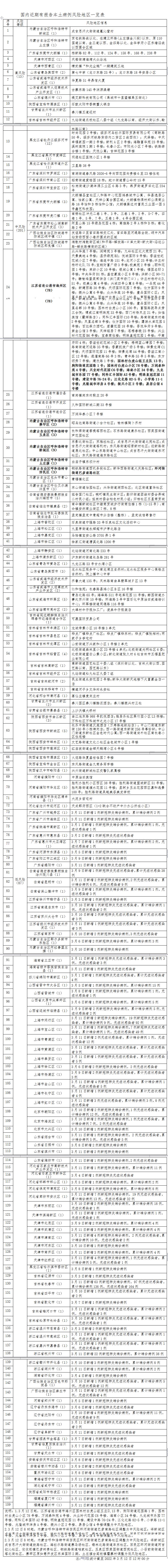 3月12日起,江苏省连云港市海州区园林村白虎山组王庄队13号、朐阳街道花园路1号、园林村白虎山小区78号楼、万润泰和苑4号楼、兴业时代花园C6号楼、海南小区34号楼、九龙城市乐园77号楼、同科汇丰国际A2号楼、明珠皇冠花园11号楼、建设中路76-24号、江化北路82-5号、小学路11-1号楼、兆隆城市洋房A号楼、振兴小区2号楼、易居公馆4号楼调整为中风险地区。