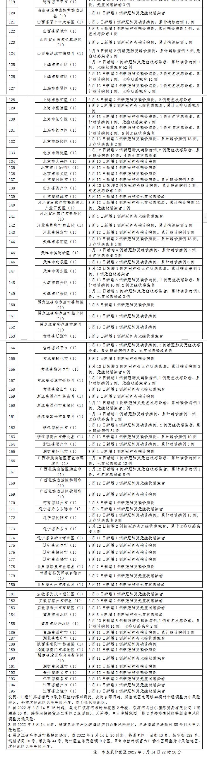1.黑龙江省哈尔滨市指挥部决定,自2022年3月14日20时起,将道里区一面街40号、新华街128号、巡船胡同18号、康安路44号,道外区宝宇天邑澜山小区,五常市拉林镇富力广场小区调整为中风险地区。
