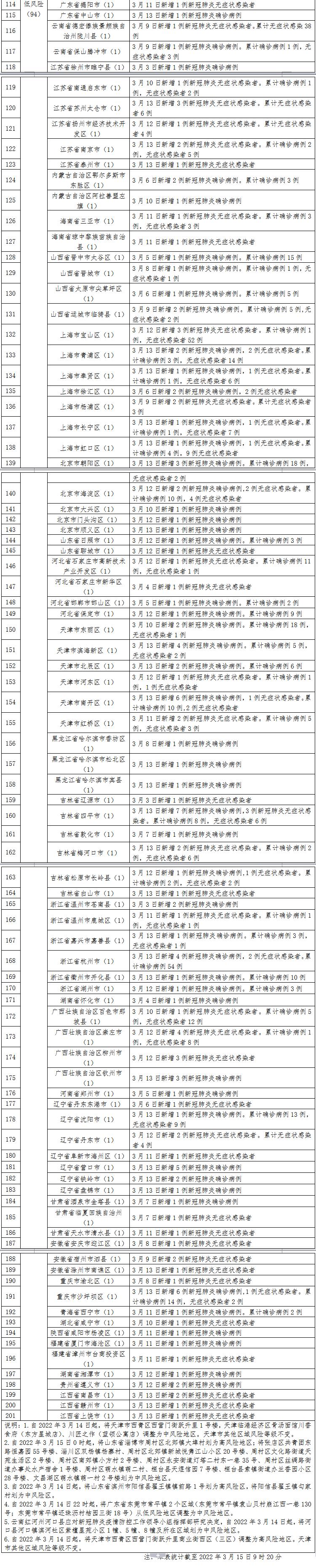 4.自2022年3月14日22时起,将广东省东莞市常平镇2个区域(东莞市常平镇袁山贝村崩江西一巷130号;东莞市常平镇还珠沥村桔园三街18号)从低风险地区调整为中风险地 区。