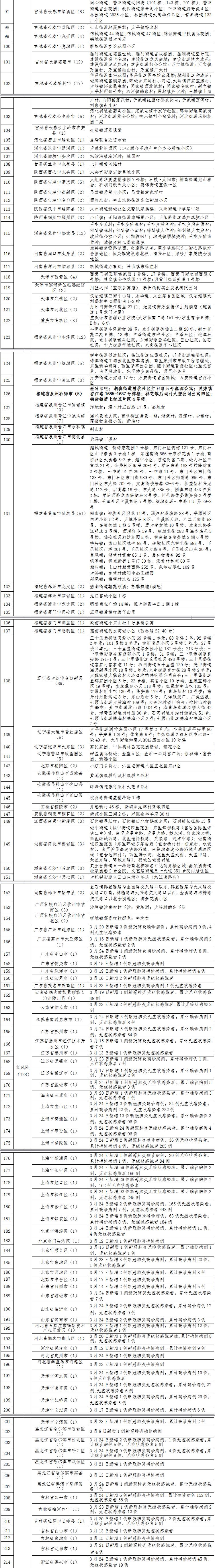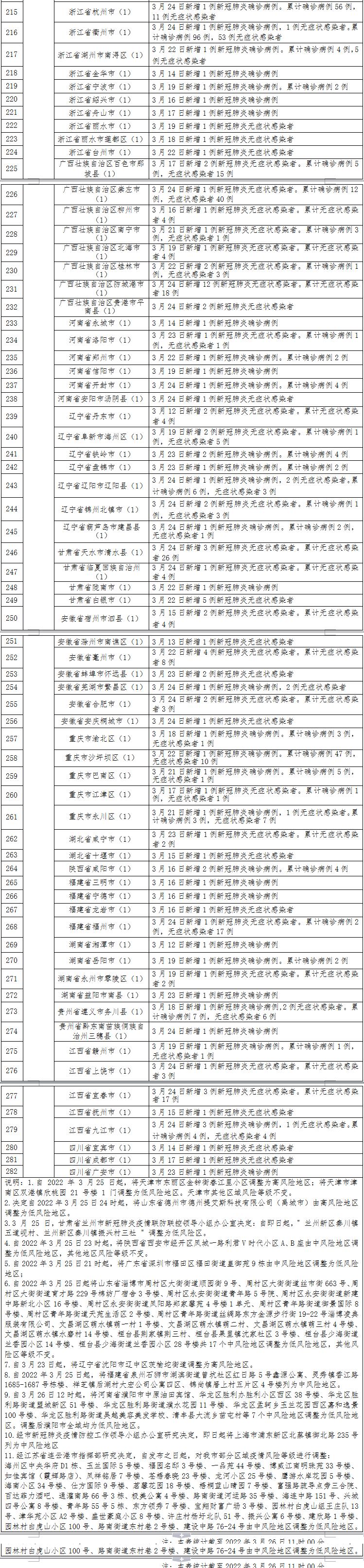 3.自2022年3月25日起,将福建省泉州石狮市湖滨街道曾坑社区红日路5号鑫源公寓、灵秀镇香江路1685-1687号栋楼、祥芝镇后湖村大宏公司公寓四区、锦尚镇厝上村五片区4号楼列为中风险地区。