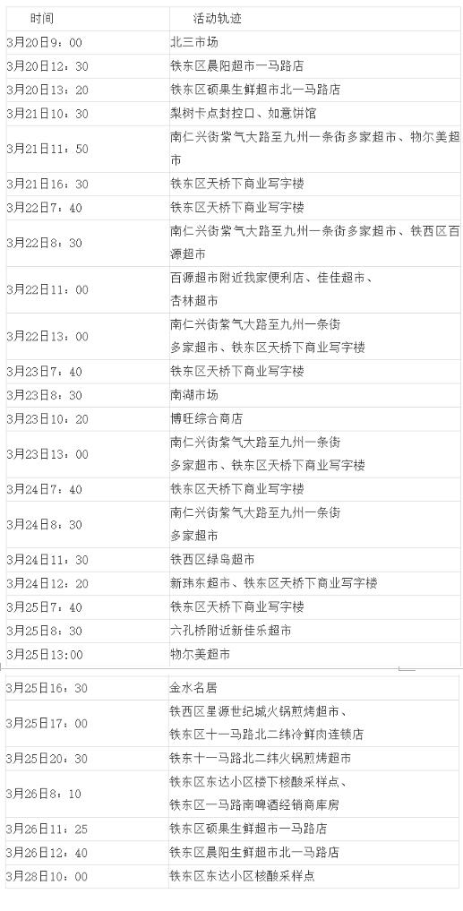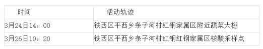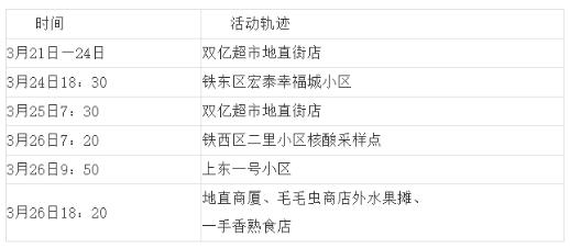 确诊病例3: 女,21岁,与确诊病例2为同小区同单元,现住址铁西区二里小区。3月27日—28日居家隔离,3月29日核酸检测为阳性,经市级专家组诊断为新冠肺炎确诊病例(轻型)。