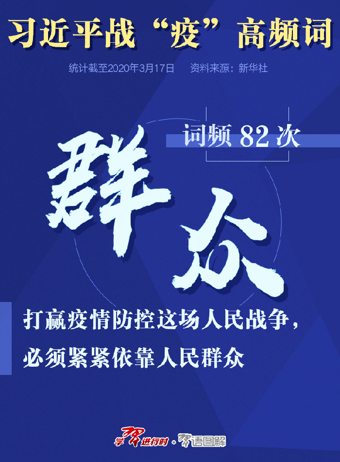 【学习进行时】新冠肺炎疫情发生以来,习近平总书记时刻关注疫情形势,亲自指挥、亲自部署这场疫情防控的人民战争、总体战、阻击战。 习近平多次主持召开重要会议,频频作出重要指示,亲临一线调研指导,连续开展“电话外交”……新华社《学习进行时》原创品牌栏目“讲习所”推出文章,以1月20日至3月17日新华社通稿为样本,为您梳理习近平战“疫”期间提到的高频词。 高频词:防控 |