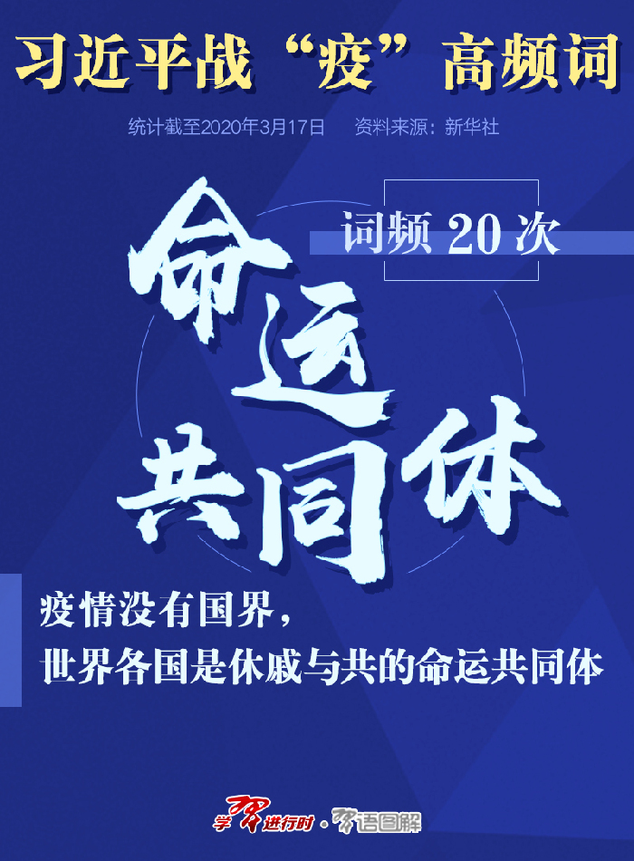 战“疫”期间,“命运共同体”一词,习近平提到了20次,这与总书记提出的构建人类命运共同体一脉相承。 当前,新冠肺炎疫情在多国多点扩散,形势令人担忧。习近平指出,疫情没有国界,世界各国是休戚与共的命运共同体。 在中国抗疫的关键时期,中国得到来自各方的宝贵支持。在他国遭遇挑战的困难时刻,中国感同身受,即便自己处于困难之中,仍然以大国担当的责任和勇气,伸出援手。中方愿同有关国家分享防控经验,开展药物和疫苗联合研发,并正在向出现疫情扩散的一些国家提供力所能及的援助。人类命运共同体理念在这次举世抗击新冠疫情的斗争中得到了鲜明体现。 越是在危难时刻,越是要守望相助;越是在紧要关头,越是要密切合作。我们有理由坚信,只要全球携手合作,就一定能共克时艰,战胜疫情。 |