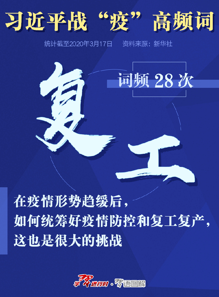 白衣执甲,逆行出征,奋战在一线的医务人员是这场战“疫”英勇的将士,是总书记心中“最可爱的人”。 习近平在多个场合表达对白衣天使的敬意和关怀,称他们是“光明的使者、希望的使者,是最美的天使,是真正的英雄”! 他还专门作出重要指示,强调务必高度重视对医务人员的保护、关心、爱护;要求出台一系列关心关爱一线医务人员的政策措施,帮助大家解除后顾之忧…… 一言一行,饱含着总书记对白衣天使的敬意和深情。 高频词:复工 |