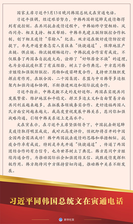新华社北京5月13日电 国家主席习近平5月13日晚同韩国总统文在寅通电话。 习近平强调,经过艰苦努力,中韩两国新冠肺炎疫情都得到有效控制。在共同抗击疫情过程中,中韩始终守望相助、风雨同舟、相互支持、相互帮助。中韩率先建立联防联控合作机制,创下相互疫情“零输入”纪录。双方还在做好疫情防控前提下,率先开通重要急需人员往来“快捷通道”,保障地区产业链、供应链、物流链顺畅运行。中韩抗疫合作富有成效,不仅服务了两国各自抗疫大局,诠释了“好邻居金不换”的道理,也为全球抗疫积累了有益经验,树立了合作典范。中方愿同韩方继续加强联防联控、药物和疫苗研发合作,支持世卫组织发挥应有作用,在联合国、二十国集团、东盟与中日韩等多边框架内加强沟通和协调,不断推进双边和国际抗疫合作。 习近平指出,中韩是搬不走的友好近邻。两国在实现共同发展繁荣、维护地区和平稳定、捍卫多边主义和自由贸易方面共同利益越来越多,在拓展各领域务实合作、更好造福两国人民方面空间越来越大。我高度重视发展中韩关系,愿同你加强战略沟通,引领中韩关系迈上更高水平。 文在寅表示,在习近平主席坚强领导下,中国抗击新冠肺炎疫情取得明显成效,我对此高度评价,预祝即将召开的中国全国两会圆满成功!韩中两国抗击疫情的思路和举措相似,抗疫合作卓有成效,特别是率先开通“快捷通道”,传递了两国团结合作的有力信号,也为世界树立了典范。韩方愿同中方继续沟通合作,为推动国际社会加强团结互信、战胜疫情发挥积极作用。韩方期待同中方保持密切沟通,推动韩中关系不断发展。 |