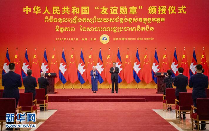 11月6日,国家主席习近平在北京人民大会堂为柬埔寨太后莫尼列举行中华人民共和国“友谊勋章”颁授仪式。 新华社记者 张领 摄