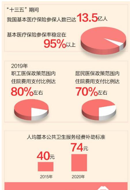 基本医疗保障网越织越密,村民的看病负担越来越轻。“十三五”期间,我国基本医疗保险参保人数已达13.5亿人,参保率稳定在95%以上。2019年职工医保和居民医保政策范围内住院费用支付比例分别达到80%左右和70%左右。