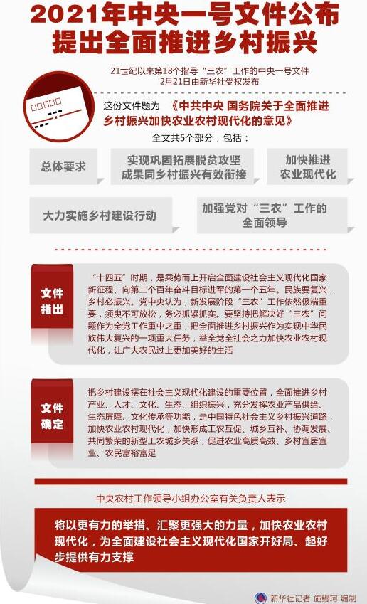 2021年中央一号文件公布 提出全面推进乡村振兴