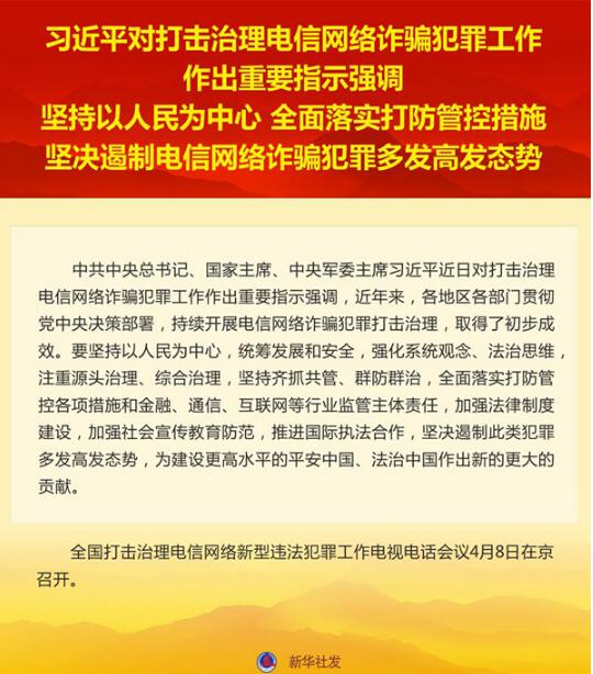 新华社北京4月9日电 中共中央总书记、国家主席、中央军委主席习近平近日对打击治理电信网络诈骗犯罪工作作出重要指示强调,近年来,各地区各部门贯彻党中央决策部署,持续开展电信网络诈骗犯罪打击治理,取得了初步成效。要坚持以人民为中心,统筹发展和安全,强化系统观念、法治思维,注重源头治理、综合治理,坚持齐抓共管、群防群治,全面落实打防管控各项措施和金融、通信、互联网等行业监管主体责任,加强法律制度建设,加强社会宣传教育防范,推进国际执法合作,坚决遏制此类犯罪多发高发态势,为建设更高水平的平安中国、法治中国作出新的更大的贡献。