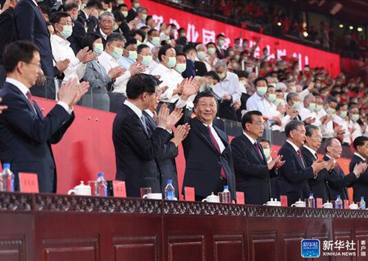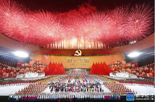 6月28日晚,庆祝中国共产党成立100周年文艺演出《伟大征程》在国家体育场盛大举行。习近平、李克强、栗战书、汪洋、王沪宁、赵乐际、韩正、王岐山等党和国家领导人,同约2万名观众一起观看演出。新华社记者 鞠鹏 摄 新华社北京6月28日电 筚路蓝缕创伟业,初心不忘再起航。庆祝中国共产党成立100周年文艺演出《伟大征程》28日晚在国家体育场盛大举行。习近平、李克强、栗战书、汪洋、王沪宁、赵乐际、韩正、王岐山等党和国家领导人,同约2万名观众一起观看演出,共同回顾中国共产党成立100年来波澜壮阔的光辉历程,共同祝福伟大的党带领中国人民迈进新征程、奋进新时代。 6月28日晚,庆祝中国共产党成立100周年文艺演出《伟大征程》在国家体育场盛大举行。习近平、李克强、栗战书、汪洋、王沪宁、赵乐际、韩正、王岐山等党和国家领导人,同约2万名观众一起观看演出。新华社记者 庞兴雷 摄 夜幕下的奥林匹克中心区流光溢彩、美轮美奂,喜庆的中国结灯饰、醒目的庆祝活动标识、多彩的盘龙式花柱,表达着对中国共产党百年华诞的喜庆祝福。金光映射中的国家体育场“鸟巢”,与深蓝色的国家游泳中心“水立方”遥相呼应。 国家体育场内,灯光璀璨。中央舞台的巨型屏幕上,金色党徽在红色幕布的衬托下熠熠生辉,两侧分别书写着“1921”和“2021”金色字样。舞台最高处,100名礼号手身姿挺拔,两侧旋转布景中,战士的群像岿然屹立。英姿勃发的青年手捧红色花束,汇聚在舞台中央。 6月28日晚,庆祝中国共产党成立100周年文艺演出《伟大征程》在国家体育场盛大举行。习近平、李克强、栗战书、汪洋、王沪宁、赵乐际、韩正、王岐山等党和国家领导人,同约2万名观众一起观看演出。新华社记者 丁海涛 摄 19时57分许,在欢快的乐曲声中,习近平等领导同志走上主席台,向大家挥手致意,全场响起热烈的掌声和欢呼声。 6月28日晚,庆祝中国共产党成立100周年文艺演出《伟大征程》在国家体育场盛大举行。习近平、李克强、栗战书、汪洋、王沪宁、赵乐际、韩正、王岐山等党和国家领导人,同约2万名观众一起观看演出。新华社记者 鞠鹏 摄 随着激昂深情的歌声响起,绚烂的焰火升腾出“100”的纪年,盛放在国家体育场上空。舞台上,点点星火汇聚成党徽的图案,拉开演出帷幕。 演出以大型情景史诗形式呈现,共分为四个篇章,综合运用多种艺术手段,生动展现中国共产党百年来带领中国人民进行革命、建设、改革的壮美画卷,热情讴歌党的十八大以来,在以习近平同志为核心的党中央坚强领导下,中国特色社会主义进入新时代,昂首阔步迈向全面建设社会主义现代化国家的新征程。 “这个政党一定能指引中国走向光明,让中国人过上好日子……”戏剧与舞蹈《破晓》再现了近代以后,中华民族饱经磨难,无数仁人志士前赴后继寻找救国救民真理,直到1921年中国共产党诞生,中国革命的面貌焕然一新。第一篇章“浴火前行”,以情景舞蹈《起义 起义》、歌舞《土地》、戏剧与舞蹈《长征》、情景大合唱《怒吼吧 黄河》、合唱与舞蹈《向前 向前 向前》等节目,生动展现在大革命的烽烟中,在艰险的长征路上,在抗日战争、解放战争的沙场上,中国共产党团结带领中国人民浴血奋战、淬火成钢的伟大历程。 打破了一个旧世界的中国共产党人,能否建设一个新世界?第二篇章“风雨无阻”以舞蹈《开国大典》开篇,回顾热火朝天的社会主义革命和建设年代。在震耳欲聋的炮声中,情景合唱与舞蹈《战旗美如画》呈现抗美援朝的激战场面,讴歌志愿军战士保家卫国的炽热情怀。在慷慨激昂的唱腔中,戏曲与舞蹈《激情岁月》生动描画王进喜、史来贺、雷锋、钱学森、焦裕禄等一批先锋模范的奋斗群像。 带领中国人民站起来的中国共产党,能不能带领人民富起来?党的十一届三中全会胜利召开,作出改革开放的历史性回答。在第三篇章“激流勇进”中,舞蹈《春潮澎湃》把春天的故事铺展在希望的田野,歌舞《特区畅想曲》跃动着特区“先行先试”的时代脉搏,情景合唱与舞蹈《回归时刻》欢庆香港、澳门回归祖国怀抱,诗朗诵与合唱《跨越》讴歌西气东输、西电东送、南水北调、北煤南运等重大国家工程。情景舞蹈《党旗在我心中》表现了在中国共产党领导下,全国人民勠力同心、众志成城,取得抗击“非典”、抗震救灾的伟大胜利。合唱与舞蹈《行进的火炬》让人们重温北京奥运会、上海世博会、神舟七号飞船发射等激动人心的历史场景。 第四篇章“锦绣前程”展开一幅新时代的壮阔图景,回顾了党的十八大以来,以习近平同志为核心的党中央统揽伟大斗争、伟大工程、伟大事业、伟大梦想,党和国家事业取得了历史性成就、发生了历史性变革。戏剧与歌舞《东方奇迹》讲述闽宁镇、十八洞村的脱贫攻坚故事,宣示中国共产党人引领中华民族实现全面小康的伟大胜利。情景交响歌舞《人民至上》再现新冠肺炎疫情发生后,一场举国动员、上下同心的全民战“疫”。情景歌舞《强军战歌》通过多军兵种一体化实战演习的纪实表演,展示了在习近平强军思想指引下,人民军队阔步前进的豪迈姿态。诗朗诵与合唱《强国力量》展现了在以习近平同志为核心的党中央坚强领导下,日益强大的中国力量。鼓乐歌舞《新的天地》,一面直径10米的巨型大鼓和