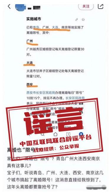 真相:近日,一则“离婚限号”的消息在网上流传,称南京、青岛、广州、大连、西安等多个城市的婚姻登记处对离婚业务进行了数量限制,引发网民关注。经媒体求证,上述城市多个婚姻登记处均明确表示不存在“离婚限号”,并未对离婚业务量限额。婚姻登记处大都采取网上预约和现场排队相结合的方式,一般优先办理线上预约的离婚申请。调查发现,一些搜索引擎“离婚限号”词条引用消息来源多截取自2013至2014年的新闻报道。(来源:“江苏新闻”微信公众号、顶端新闻)