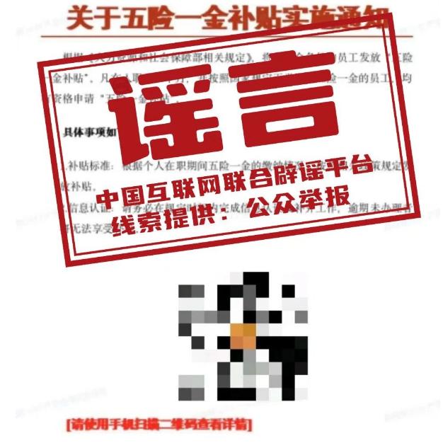 真相:近日,有网民反映收到一份所谓《关于五险一金补贴实施通知》,该通知声称:“按照人社部相关规定,凡入职满一个月,并按照国家规定正常缴纳五险一金的员工,均有资格申请‘五险一金补贴’,请务必在规定时间内完成信息认证及补齐工作,逾期未办理者将无法享受补贴。”对此,人力资源社会保障部表示,从未发放过所谓的“五险一金补贴”,上述通知为不实信息且涉嫌诈骗。这类诈骗信息的常见套路是,利用非法途径获取网民手机号、微信号或邮箱账号等,发送虚假信息,诱导群众扫描二维码或点击链接,进入假冒的“官方”小程序或网站,并填写身份证、银行卡、验证码等个人信息,以达到骗取钱财的目的。(来源:“人力资源和社会保障部”微信公众号)