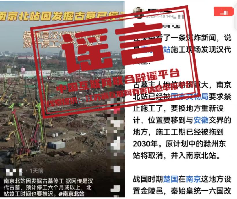 真相:近日,有网民在网络平台发帖称,南京北站因挖到古墓,“已经被国家文物局要求禁止施工了”“预计停工六个月或以上”“施工工期已经被拖到2030年”等。经江苏省互联网辟谣平台与省文物部门和属地核实,目前没有收到国家文物局关于“南京北站禁止施工”的有关通知,南京北站除个别涉及考古发掘作业区域外,其他施工作业均按计划正常有序推进,网传信息系谣言。(来源:江苏省互联网辟谣平台、“南京网络辟谣”微信公众号)