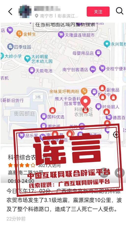 真相:2月12日,有网民在某短视频平台发文称“今日下午17:02分,广西南宁高新南二路的科德农贸市场发生了3.1级地震。”经向有关部门核实,此信息为谣言。据广西地震台网和南宁市地震监测中心数据显示,南宁市及其邻区无有感地震发生,亦无震情和灾情信息反馈。目前,谣言线索已转交相关部门对造谣者进行进一步调查处置。(来源:“广西互联网违法和不良信息举报”微信公众号、南宁市互联网举报·辟谣平台)