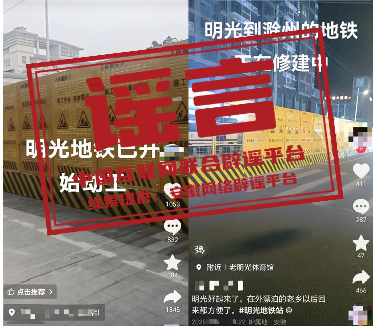 真相:近日,网民“张**”“沙**”等发布视频,编造并传播“明光地铁已开始动工”相关虚假信息,并配以误导性视频,引发关注和讨论。经核实,相关视频内容对应区域施工项目并非修建地铁,网传视频系谣言。明光市委网信办和市公安局已依法对张某、沙某等进行批评教育,并要求其删除相关不实信息。(来源:“安徽省互联网违法和不良信息举报”微信公众号、明光市委网信办)