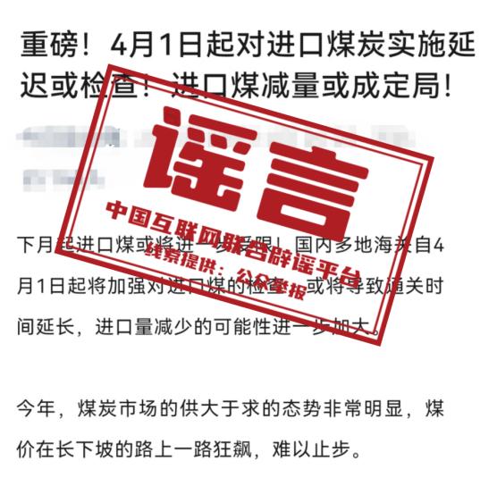 辟谣:关于“海关将对进口煤炭实施延迟检查”的信息不实