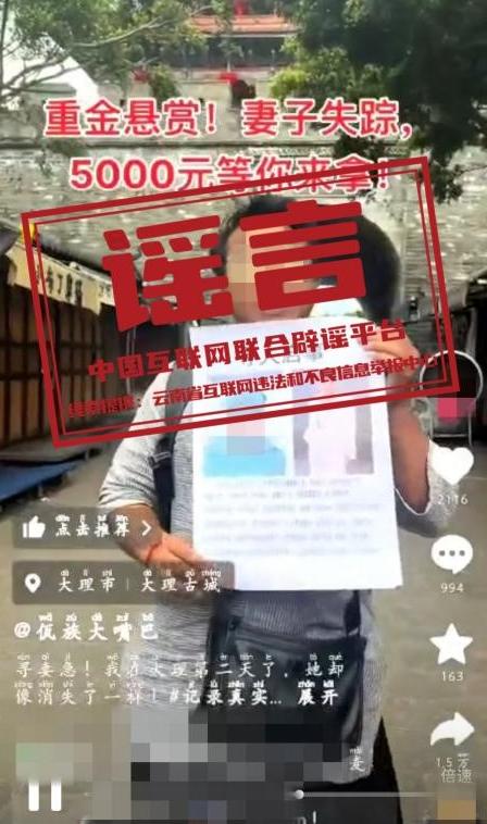 辟谣:编造“重金悬赏寻妻”虚假信息博取眼球,被依法查处