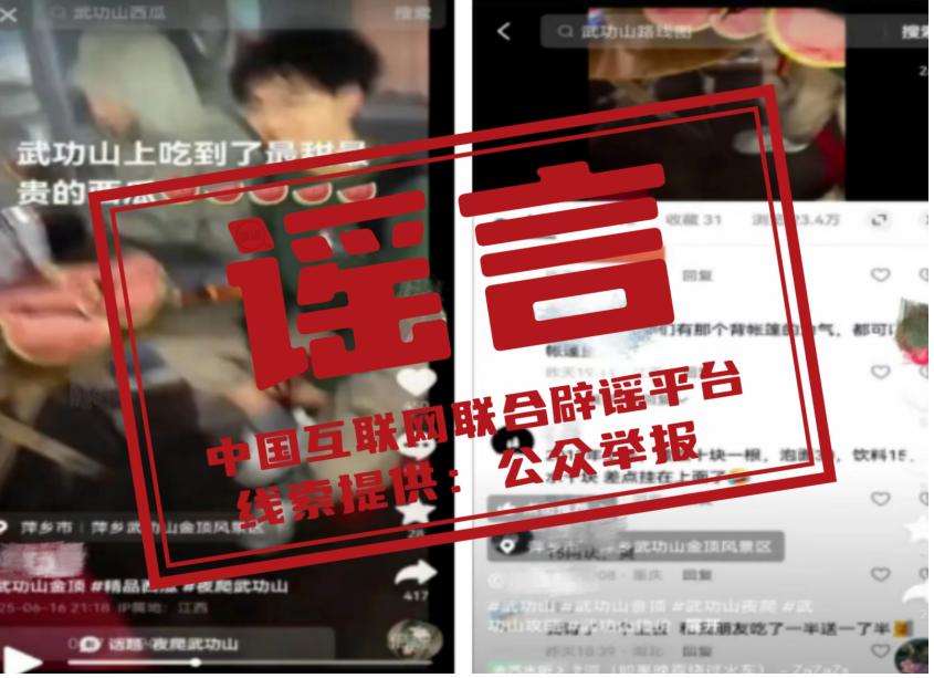 真相:近日,有网民在短视频平台发布“江西萍乡武功山景区存在‘一锤子买卖’‘天价西瓜’”的视频,引发社会关注。经查,视频中 “卖西瓜” 的男子实为旅行社组织的武功山景区游客,途中接受视频发布者邀请参与拍摄了一段“卖西瓜”的视频。该西瓜系旅行社同行人员所带,并非如视频所说在景区内购买,景区也不存在网传的“18元泡面”、“240元西瓜”等情况。目前,公安机关已对造谣者作出行政拘留十日的行政处罚。(来源:“公安部网安局”微信公众号、“江西网警”微信公众号)