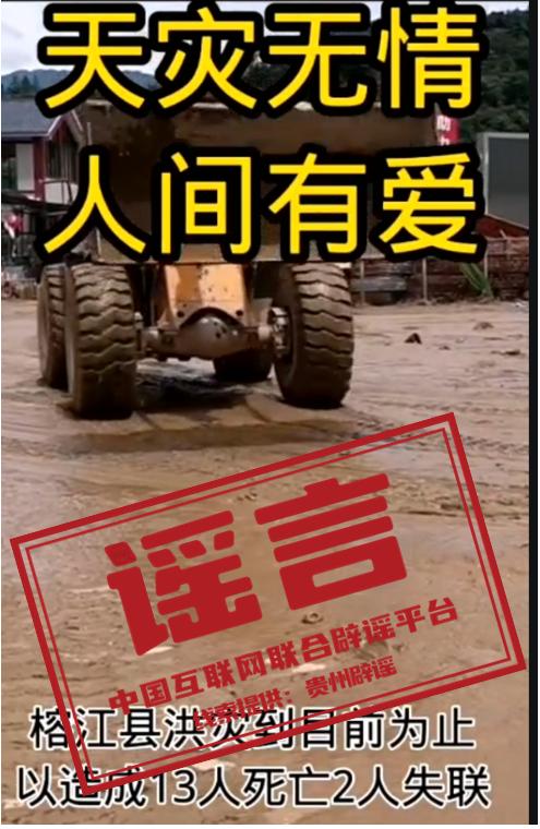 真相:近日,网民朱某在某短视频平台发布贵州榕江洪灾视频,并配文“榕江县洪灾目前为止已造成13人死亡2人失联”。经警方调查,该信息为虚假信息,系朱某为博取流量、吸引关注,在未经证实的情况下捏造的。目前,朱某因故意散布不实信息,构成治安违法行为,已被警方依法予以行政处罚。同时,公安机关责令其立即删除相关不实信息,消除不良影响。(来源:贵州交通广播、“贵州辟谣”微信公众号)