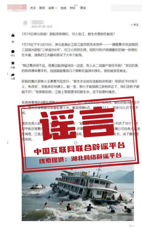 谣言:湖北宜昌游船突然倒扣、30人坠江?